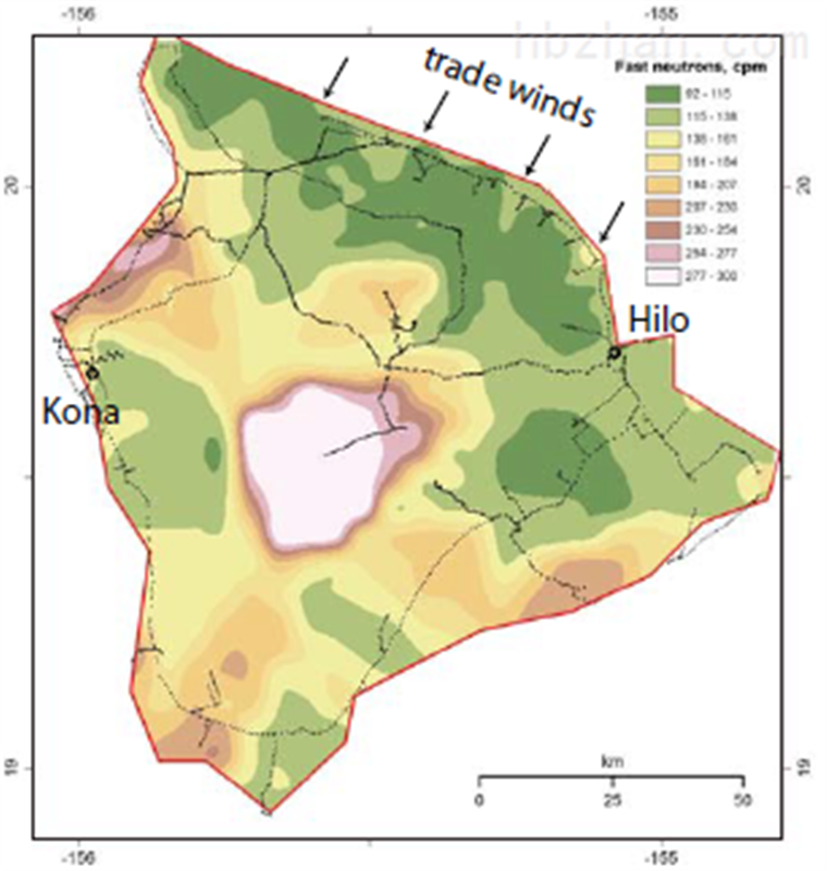 环境中的宇宙射线粒子与原子核碰撞生成高能中子,这些高能中子在穿过空气与土壤时,与介质中的原子核尤其是氢原子发生弹性碰撞而改变方向,并失去部分能量,逐渐慢化。碰撞后返回地表部分的快、慢中子将在地表以极快的速度达到平衡,其浓度受表层土壤湿度显著影响。通过中子探测器,探测地表附近的特定能量范围的快中子或慢中子强度,就可以通过修正关系计算出大面积的土壤平均含水量。快中子强度用于计算土壤含水量,而慢中子强度用于计算地表积雪深度。